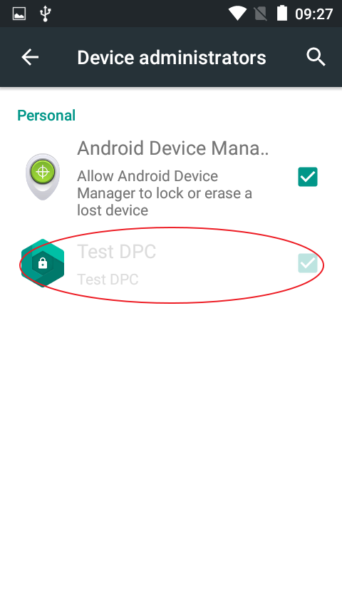 進入Settings->Security->Device administrators看到Test DPC變成灰色,它被設置成了Device Owner.