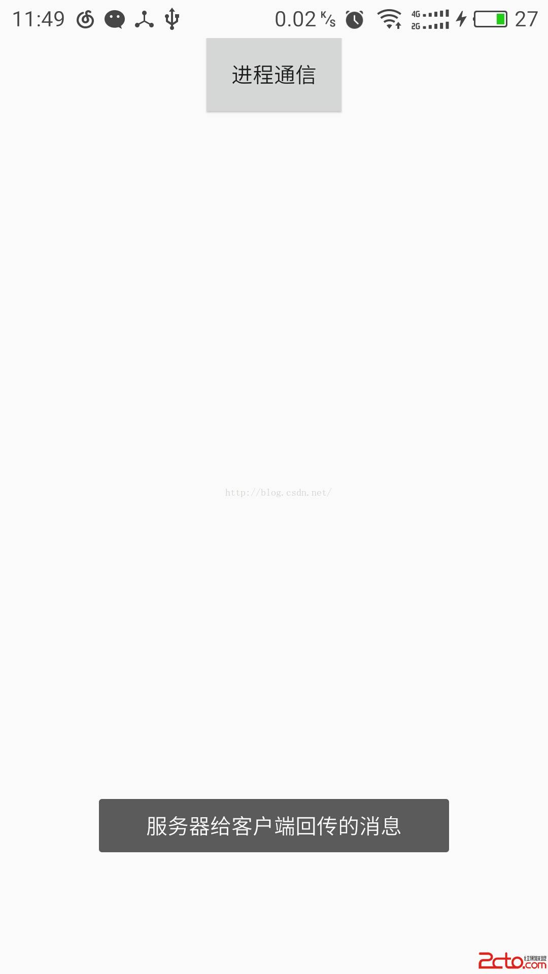 運行MessengerActivity,點擊進程通信按鈕,就可以首先看到客戶端發送到服務端的“hellow”消息,3秒後,就可以看到服務端發送給客戶端的“服務端給客戶端回傳的消息”消息,大公告成,使用Messenger實現了Activity和Service的數據雙向互通。