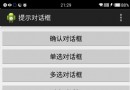 目標效果: 程序運行,顯示圖一的幾個按鈕,點擊按鈕分別顯示圖二到圖六的對話框,點擊對話框的某一項或者按鈕,也會顯示相應的吐司輸出。 1.activity_