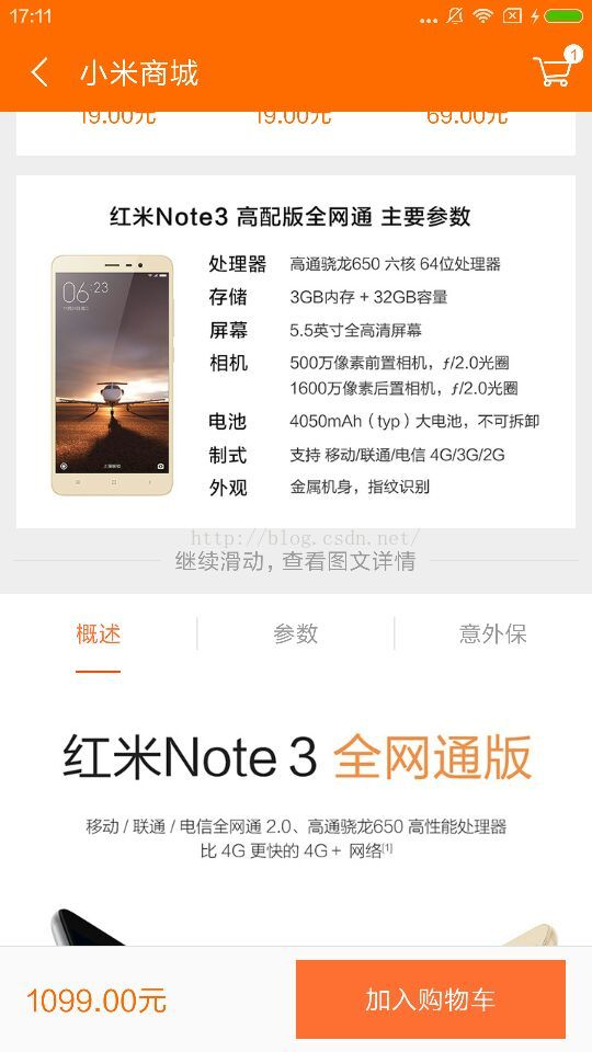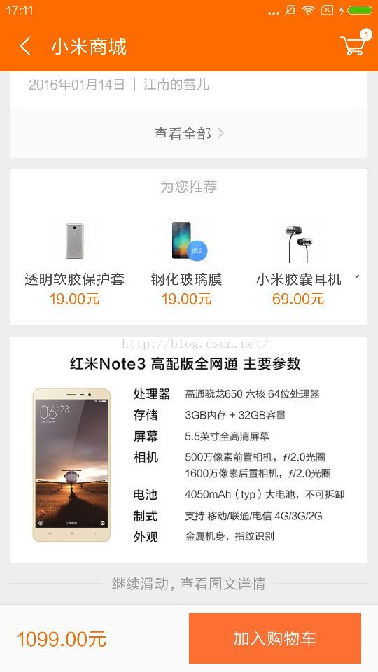 該界面仿小米商城App商品詳情界面,也類似蘑菇街、京東、淘寶等界面。