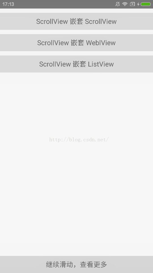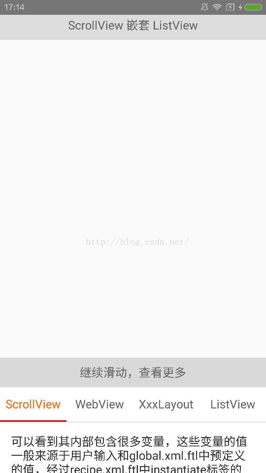 如果內部ScrollView是固定高度,那麼需要滾動,外部的當然也需要滾動,所以要判斷當內部滾動到頂部並且手指繼續下滑時,把事件交父類處理,同樣當滾動到底部並繼續上滑時也要交出去,如果InnerScrollView的ChildView高度小於等於InnerScrollView高度(就是不出現滾動條)時,把事件交給父類處理。