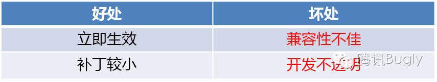 總的來說,Qzone方案好處在於開發透明,簡單,這一套方案目前的應用成功率也是最高的,但在補丁包大小與性能損耗上有一定的局限性。特別是無論我們是否真正應用補丁,都會因為插樁導致對程序運行時的性能產生影響。微信對於性能要求較高,所以我們也沒有采用這套方案。