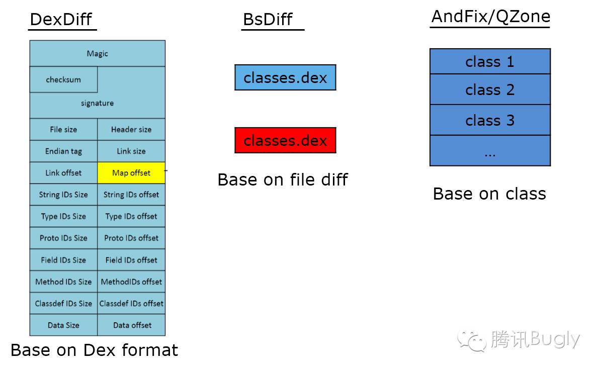 簡單來說,在編譯時通過新舊兩個Dex生成差異path.dex。在運行時,將差異patch.dex重新跟原始安裝包的舊Dex還原為新的Dex。這個過程可能比較耗費時間與內存,所以我們是單獨放在一個後台進程:patch中。為了補丁包盡量的小,微信自研了DexDiff算法,它深度利用Dex的格式來減少差異的大小。它的粒度是Dex格式的每一項,可以充分利用原本Dex的信息,而BsDiff的粒度是文件,AndFix/QZone的粒度為class。