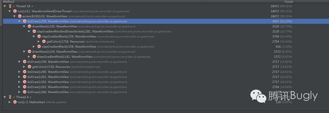 從截圖中可以看到計算量被均分到不同的繪制方法中,已經沒有瓶頸點了,並且實測動畫也變得流暢了。 一般卡頓都能通過此種方法比較精確的找到真正的瓶頸點。
