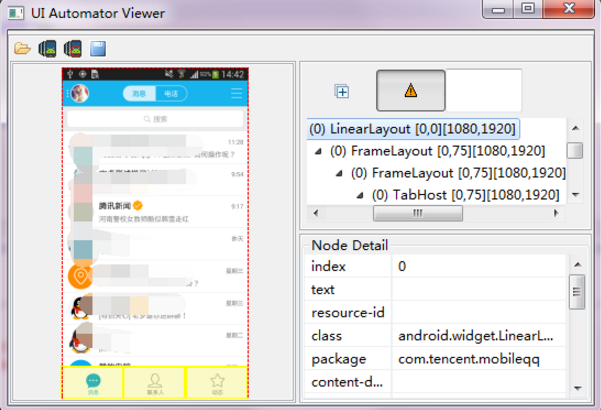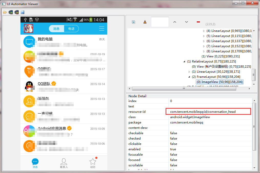 點擊左上角的頭像控件之後,右下方區域就會顯示這個控件的詳細信息。比如這裡我們可以得知它的resource-id就是com.tencent.mobileqq:id/conversation_head。