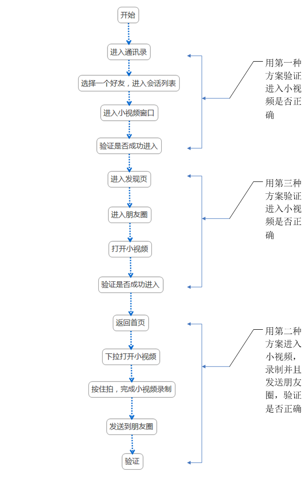 我們除了要驗證這地方的入口外,還需要在其中一處完成對小視屏的發送,並且驗證小視屏發送成功。因此我們可以按照下面流程來進行測試腳本的編寫,流程圖如下所示: