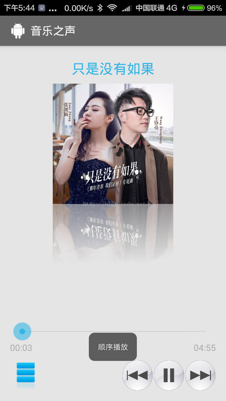 實現功能:順序播放隨機播放單曲循環PlayActivity(獨立音樂播放界面)的專輯封面圖片的倒影效果另外,我打算開始找工作,如果沈陽或周邊城市公司有意,也請與我聯系。實