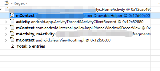 根據提供Demo的xx.hprof文件跟蹤發現HomeActivity裡面調用了DrawableHelper類,內部mContext變量引起內存洩漏,這裡的mContext變量如下(由於內部其他多個方法設置屬性需要Context對象,本應該傳入一次放到構造方法裡面,private 不要static屬性就好,但是呢不同的Activity調用就會造成Context對象問題,所以最好傳入的Context對象為activity.getApplicationContext,亦或者其他今天屬性方法傳入參數,這樣DrawableHeper不用保存Context實例引用,由此分析讓我明白了一點:不是什麼時候都適合用單例模式,要具體問題具體分析)