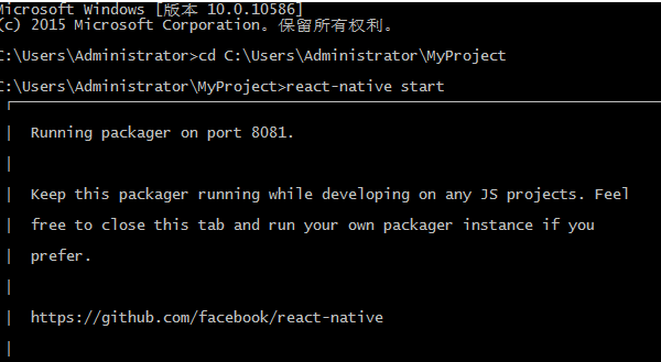 太高興了,竟然忘記去工程目錄下去運行命令了,然後cd MyProject接著react-native start,