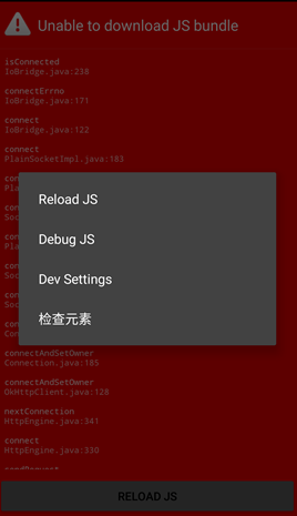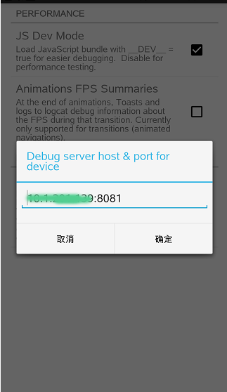 3、真機項目點擊Menu鍵(一般最左邊鍵),打開調試窗,選擇配置項,點最後一項輸入PC的IP地址和端口號8081,重新loadJS