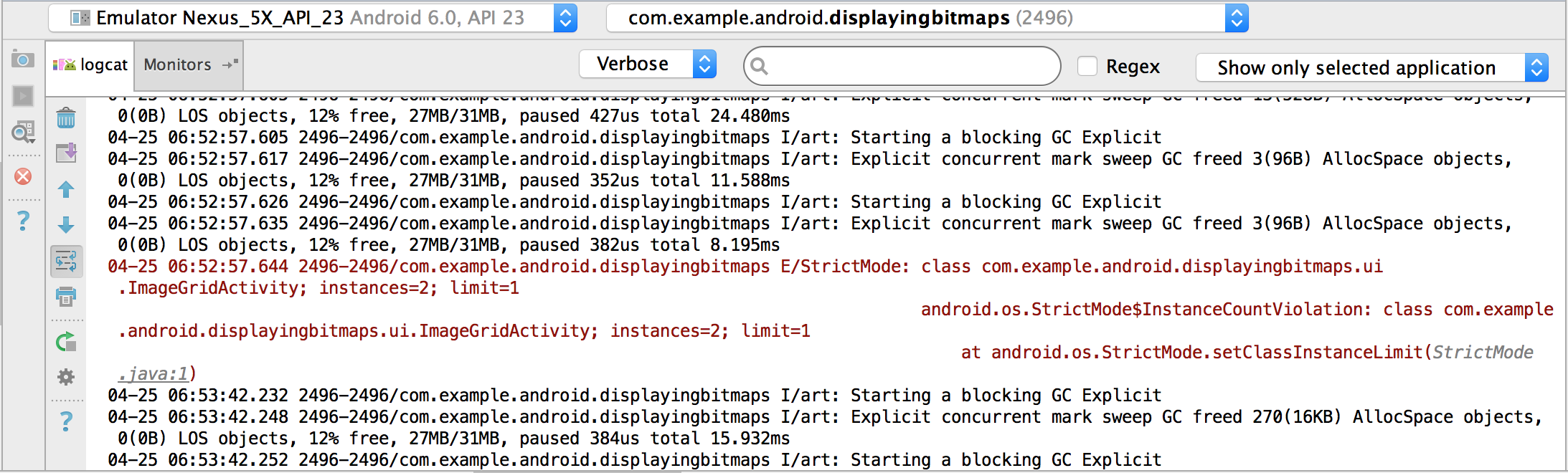 Android Studio在Android Monitor中包含了一個logcat的tab,可以打印系統事件,比如垃圾回收發生時,實時打印應用消息。為了顯示需要的信息,