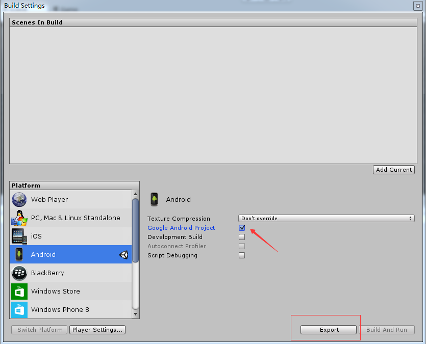 首先呢,我們就先試一試導出Android工程的接入形式,把我們的Unity工程導出,然後接入我們的Android SDK。