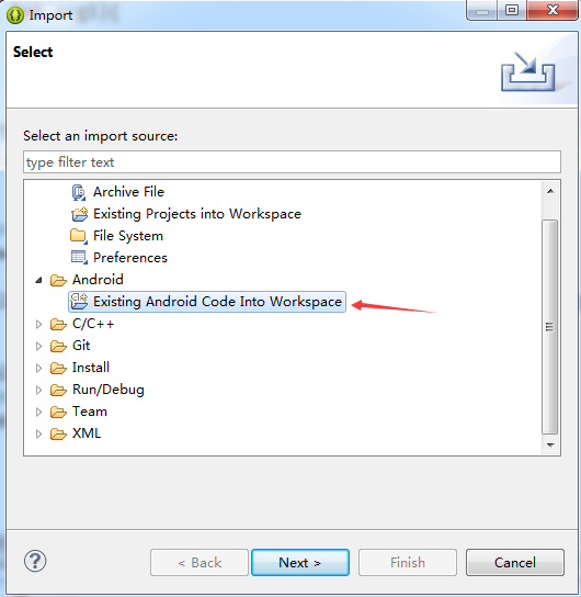 注意:這裡一定要選Existing Android Code Into Workspace,不要選Existing projects into Workspace