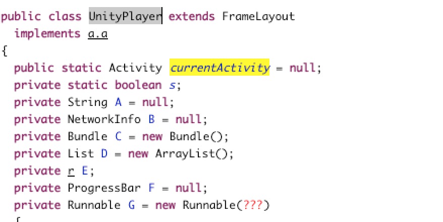 通過反編譯Unity3d生成的apk發現,UnityPlayer是FrameLayout的一個子類,而currentActivity則是UnityPlayer類中的靜態對象。