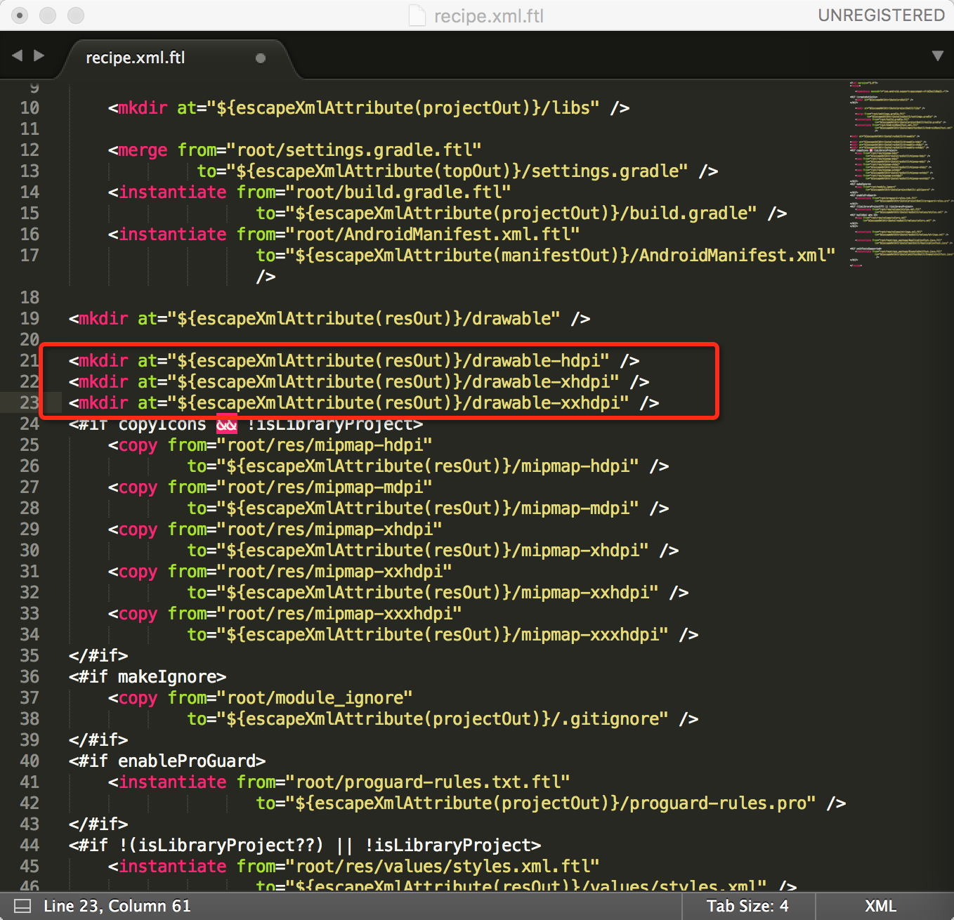 配置方法: 進入Android Studio 安裝目錄,NewAndroidModule用編輯器打開recipe.xml.ftl文件,並加入以下配置