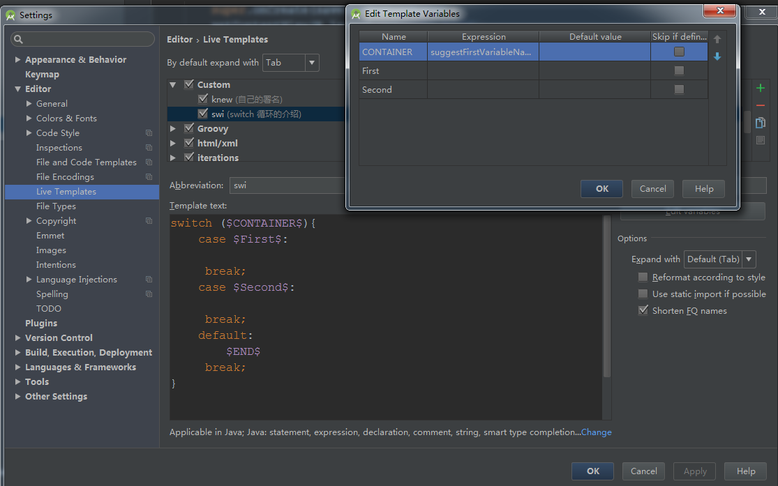 2. 提示關鍵字設置為 swi ,描述為 switch的選擇語句