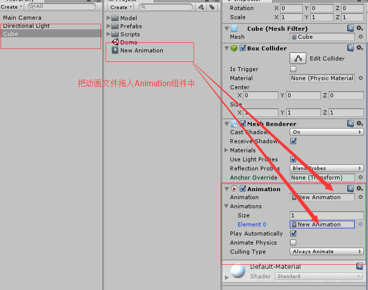 1,動畫系統配置創建游戲對象並添加Animation組件,然後將動畫文件拖入組件。進入動畫文件的Debug屬性面板選中Legacy屬性 選中游戲對象,打開Ani