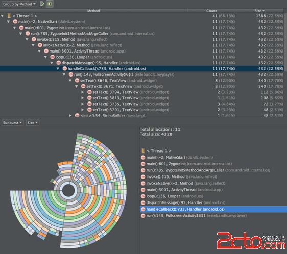 可以和Heap Viewver聯合使用來分總內存洩漏。例如,如果你看見一個位圖對象在堆內存中駐存,你能使用Allocation Tracker查到它的分配地點。
