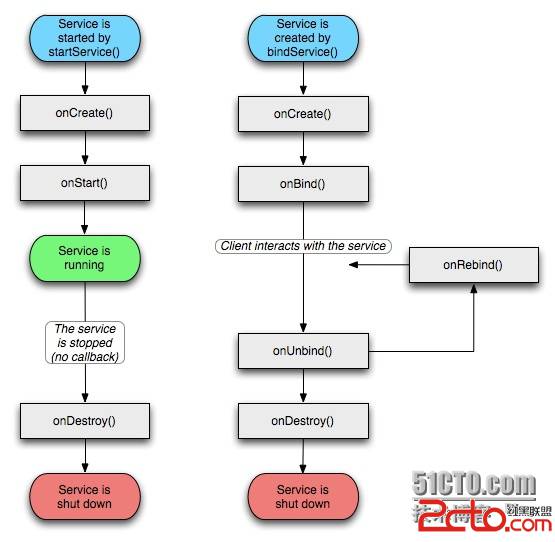 onBind將返回給客戶端一個IBind接口實例,IBind允許客戶端回調服務的方法,比如得到Service運行的狀態或其他操作。這個時候把調用者(Context,例如Activity)會和Service綁定在一起,Context退出了,Srevice就會調用onUnbind->onDestroy相應退出。