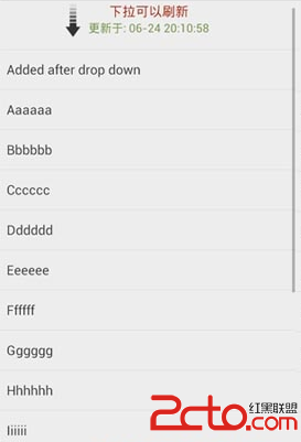 下拉刷新和上拉加載的listview的實現。(1)效果展示:首先看下大致的效果:(2) 具體使用:接著看一下怎麼使用的:2.1 在layout中定義 DropDow