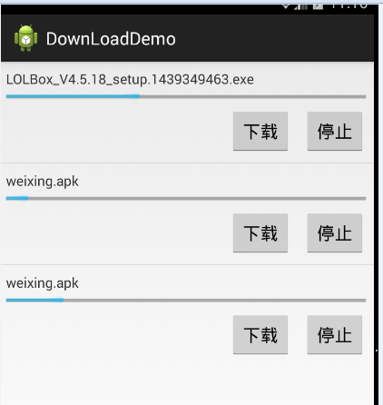 先上圖看卡結果:GITHUB:Android多線程下載斷點續傳如圖所示點擊下載就開始下載,點擊停止就會停止再次點擊下載就會接著下載了。設計思路是這樣的:首先通過廣播將下載