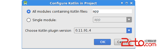 單擊警告提示條的鏈接,在彈出的對話框中點擊OK按鈕選擇默認的Kotlin插件版本即可: