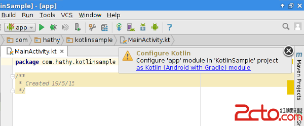 當類被創建出來後,你將會看到一個警告,提示你配置app模塊來支持Kotlin: