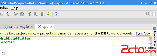 為了配置你的工程支持Kotlin,Kotlin插件修改了build.gradle文件。點擊Sync Now按鈕就可以應用這些改動了: