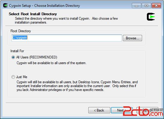 第三步:選擇安裝目錄,比如C:\Cygwin,注意此目錄是指Cygwin最終的安裝目錄,不是下載文件暫存目錄。