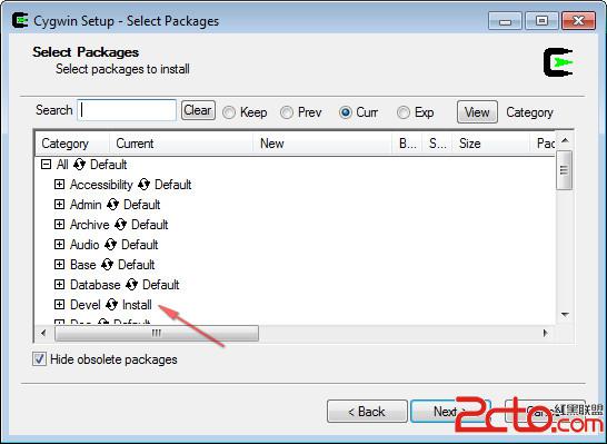 我們編譯NDK,在默認設置下,只需選擇Devel(點擊列表中Devel,將後面的Default改為Install,圖中箭頭所示),其它均為默認狀態。