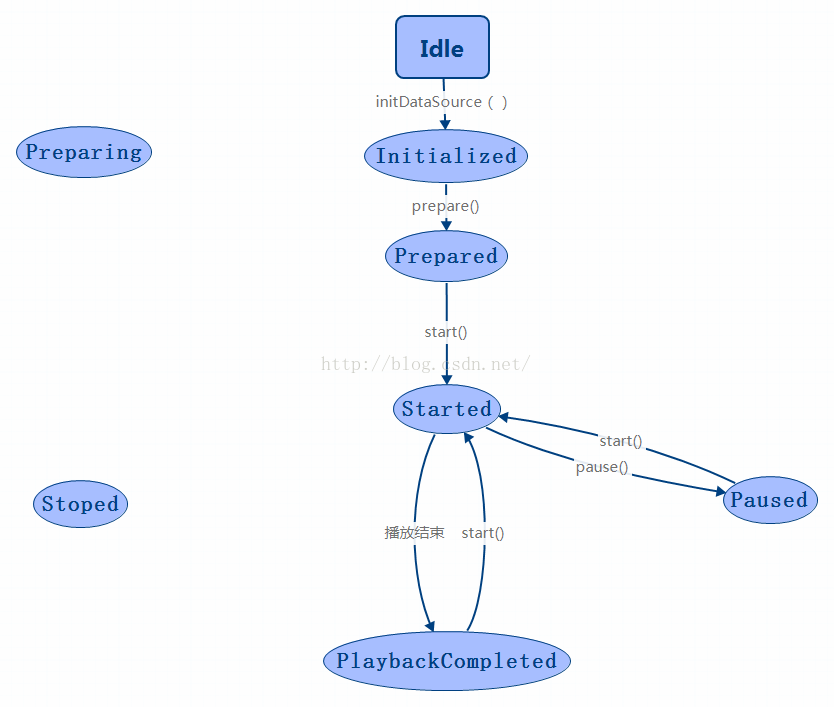 MediaPlayer的狀態轉換圖也表征了它的生命周期,搞清楚這個圖可以幫助我們在使用MediaPlayer時考慮情況更周全,寫出的代碼也更具健壯性。接下來用幾張圖,來慢
