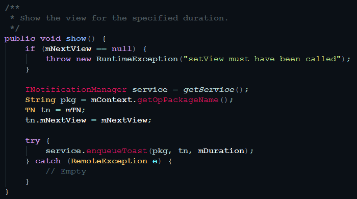 原因分析用戶使用android 5.0以上的系統在安裝APP時,將消息通知的權限關閉掉了。實際上用戶本意只是想關閉Notification,但是Toast的show方法中