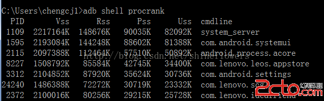 使用adb shell procrank手機中的sh是經過精簡過的,有些手機可能沒有 procrank 命令,可以使用genymotion模擬器,或是自己安裝procra