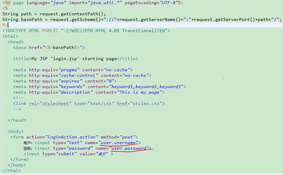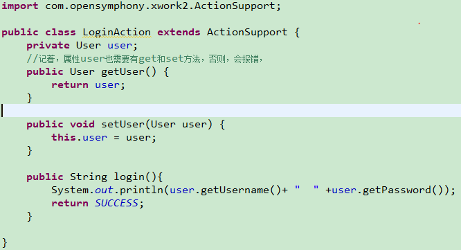從下圖的代碼可以看到,Action類中有兩個屬性:username和passwZ喎?/kf/ware/vc/" target="_blank" class="keylink">vcmQs1eLBvbj2yvTQ1MrH0+u1x8K9vefD5rXEss7K/c/gttTTprXEoaPSssno1sPBy2dldKGic2V0t723qKGjPC9wPg0KPHA+PGltZyBhbHQ9"" src="/uploadfile/Collfiles/20160423/20160423090352210.png" title="\" />