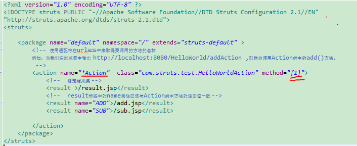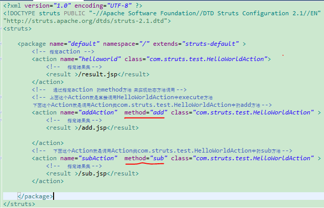 這種使用method屬性的方式來實現動態方法有一個不好的地方在於:如果只有幾個方法需要被調用,這樣還好,我們只需要在struts.xml文件中,寫幾個類似下面的代碼段。但是,如果有幾百個方法需要被動態調用,那麼用這種方法可能就不適合了,這樣代碼冗余太大,也不便於管理。因此就有了下面的兩種方法:!、通配符的使用,這裡介紹第一種。