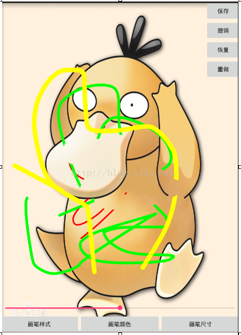 自定義view實現塗鴉功能,包括撤銷、恢復、重做、保存以及橡皮擦(在風格中實現)功能,小模塊包括畫筆顏色調整、畫筆尺寸調整、畫筆類型(包括正常畫筆以及橡皮擦功能),之後又
