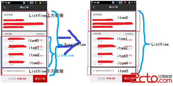 這是天貓商城的確認訂單的頁面,ScrollView中嵌套了ExpandableListView,ExpandableListView上面有固定的一些控件,下面也有固定的一些控件,整體又要能夠滾動。