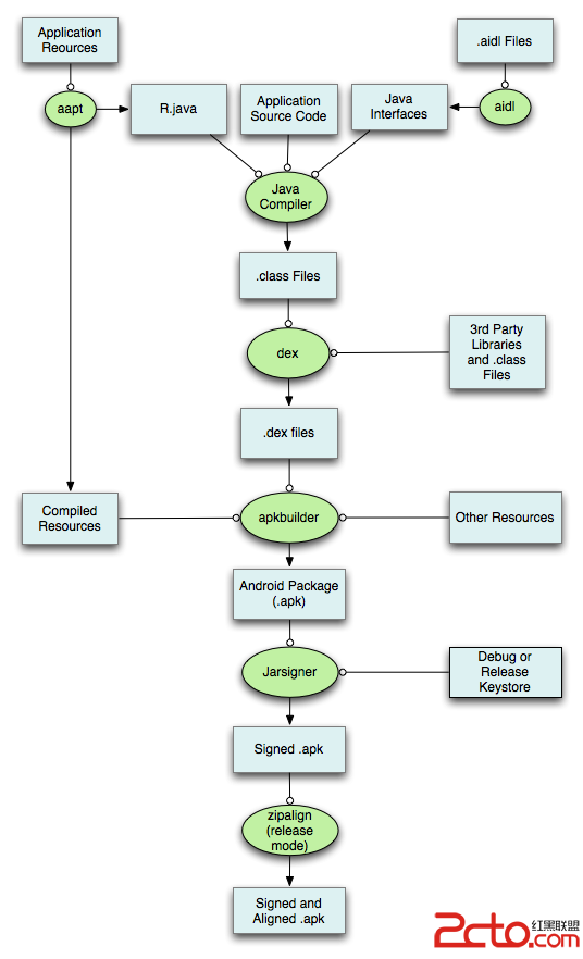 Android的編譯過程 在了解這個問題之前我們先要來看看Android 應用編譯的過程: IDE中的資源打包工具 (Android As
