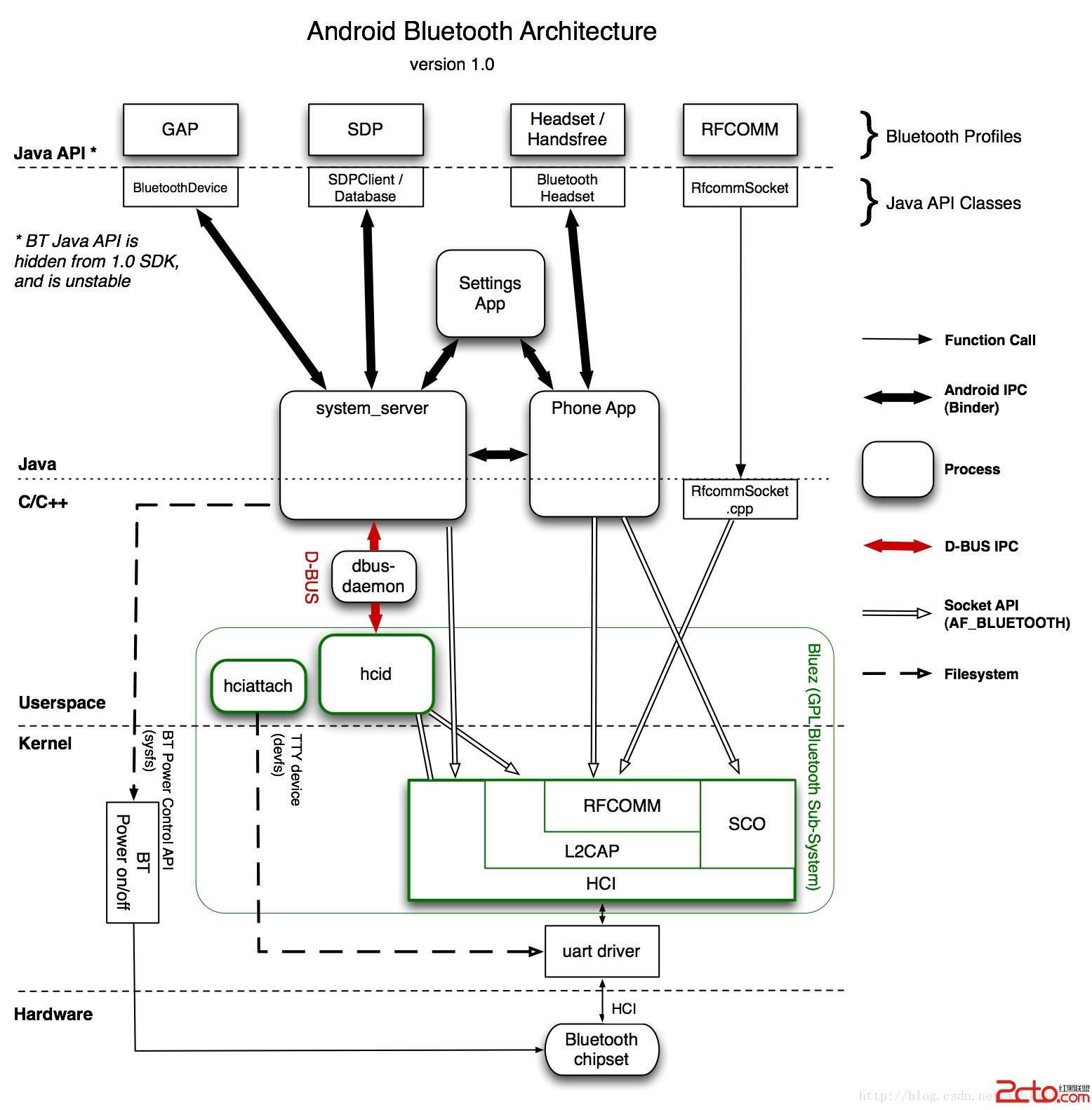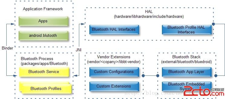 和Bluedroid類似,BlueZ也是按照標准流程從應用一直走下來,不過兩者唯一的區別是BlueZ的DBUS。blueDroid中取出DBUS是代碼結構變的更加清晰,看起來跟順暢。如下圖藍牙代碼架構(Google官方提供):
