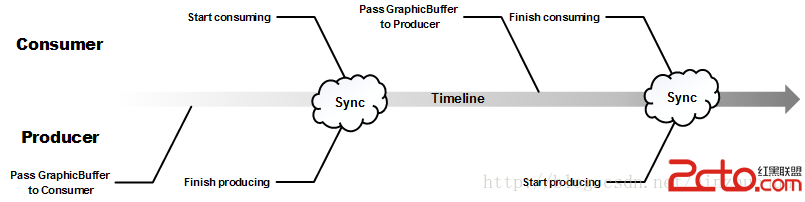這個狀態一定程度上說明了該GraphicBuffer的歸屬,但只指示了CPU裡的狀態,而GraphicBuffer的真正使用者是GPU。也就是說,當生產者把一個GraphicBuffer放入BufferQueue時,只是在CPU層面完成了歸屬的轉移。但GPU說不定還在用,如果還在用的話消費者是不能拿去合成的。這時候GraphicBuffer和生產消費者的關系就比較暧昧了,消費者對GraphicBuffer具有擁有權,但無使用權,它需要等一個信號,告訴它GPU用完了,消費者才真正擁有使用權。一個簡化的模型如下: