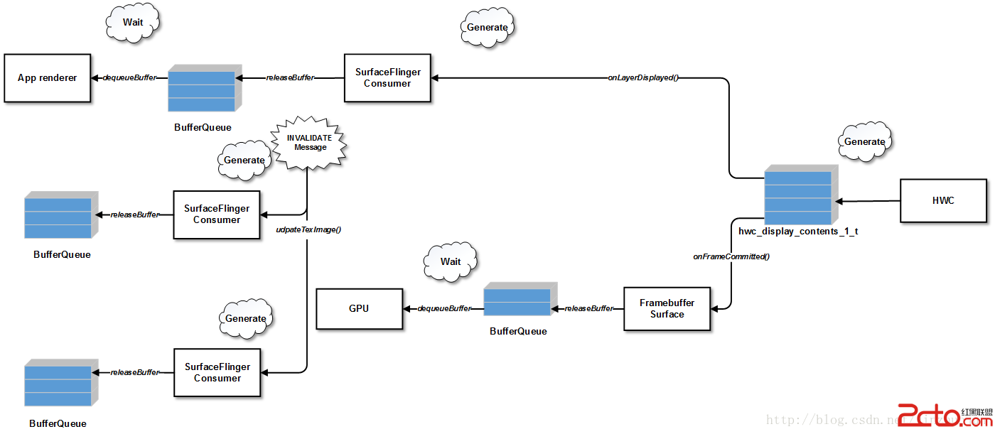 上面主要是針對Overlay的層,那對於GPU繪制的層呢?在收到INVALIDATE消息時,SurfaceFlinger會依次調用handleMessageInvalidate()->handlePageFlip()->Layer::latchBuffer()->SurfaceFlingerConsumer::updateTexImage() ,其中會調用該層對應Consumer的GLConsumer::updateAndReleaseLocked() 函數。該函數會釋放老的GraphicBuffer,釋放前會通過syncForReleaseLocked()函數插入releaseFence,代表如果觸發時該GraphicBuffer消費者已經使用完畢。然後調用releaseBufferLocked()還給BufferQueue,當然還帶著這個releaseFence。這樣,當這個GraphicBuffer被生產者再次通過dequeueBuffer()拿出時,就可以通過這個releaseFence來判斷消費者是否仍然在使用。