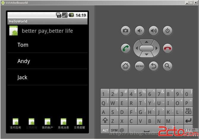 好,理論知識就介紹這麼多,開始我們的實踐,我們要實現的效果是:頁面底部放置一個TabWidget,頁頭顯示一個logo和文字介紹,頁體則顯示具體的activity對應的頁面。讓tab顯示在底部的設置很簡單,只要將TabWidget 的屬性android:layout_alignParentBottom="true"