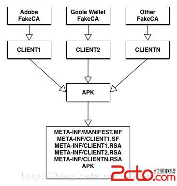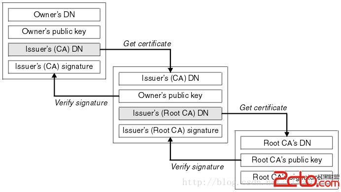 所有者: CN=Adobe Systems Incorporated, OU=Information Systems, O=Adobe Systems Incorporated, L=San Jose, ST=California, C=US 發布者: CN=Adobe Systems Incorporated, OU=Information Systems, O=Adobe Systems Incorporated, L=San Jose, ST=California, C=US 序列號: d7cb412f75f4887e 有效期開始日期: Thu Oct 01 08:23:14 CST 2009, 截止日期: Mon Feb 16 08:23:14 CST 2037除了通過自簽名的方式,我們還可以采用由CA頒發私鑰證書進行簽發。采用這種方式,最終APK中的公鑰證書中,就會包含證書鏈。這種方式跟簽名名的主要區別是最終的公鑰證書中,Issuer和Subject是不相同的,而且會存在多於一個證書,證書與證書之間是通過Issuer與Subject進行關聯的,Issuer負責對Subject進行認證,下面是證書的驗證示意圖: