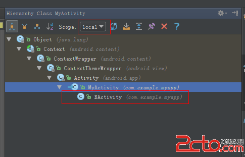 重新選擇MyActivity,然後再按F4,調出繼承關系圖,選擇第二個圖標,然後范圍選當前的類,如圖,你可以看到MyActivity的父類。