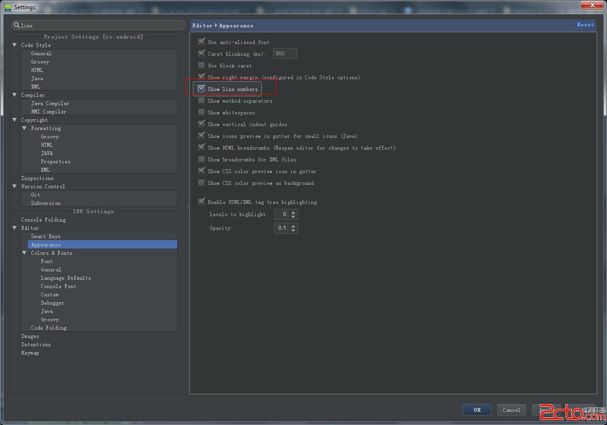 Android Studio在打開的文件左側單擊鼠標右鍵,也能像Eclipse一樣設置顯示代碼行數,如圖1。但是這邊跟Eclipse有一個很大的區別,Eclipse設置後,其余的對應文件也跟著生效,即使文件關閉後重新打開行數也還是會顯示,但是在Android Studio中這種設置只是針對本文件,而且也只是暫時的,文件關閉重新打開後行數又不顯示了,感覺這功能很雞肋啊。