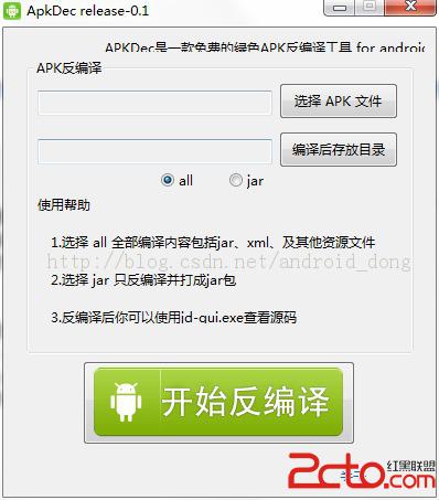 Android應用程序是用java語言來寫的,所以在反編譯方面也跟java一樣的。這裡推薦一款android反編譯工具ApkDec,該反編譯工具將Apk直接分解成java源文件的jar包和資源文件,java源文件的jar包通過jd-gui.ext就能看到源碼,包括android工程中引用的jar包中的源碼!資源文件直接打開就可以看到源碼。