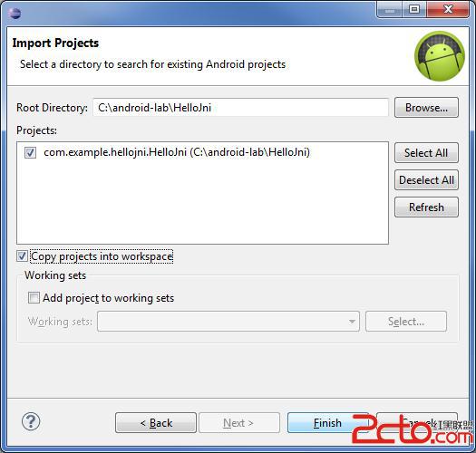 我們現在已准備好向 Eclipse 中的該項目添加 NDK build 支持。 在 Eclipse 中,右鍵單擊 hello-jni 項目 (com.example.hellojni.HelloJni) -> Android 工具 -> Add Native 支持 -> 完成。