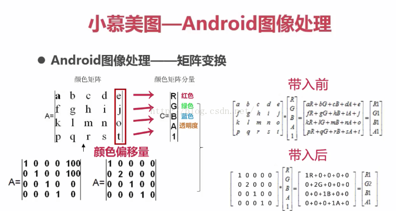 說到老照片,很多人就會想起兒時的照片。沒錯,老照片就是這樣的,我稱之為情懷濾鏡。先說一下Android圖像矩陣處理(圖片來源 慕課網)也就是說,每一個矩陣都對應著一個唯一