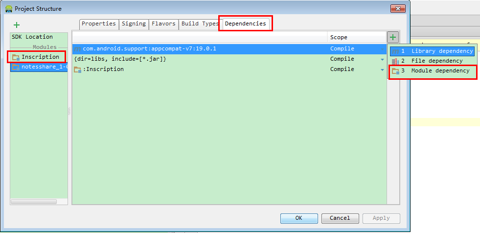 2.6添加該模板到你的工程:File->Project Structure,可以看到左側Modules一欄多出除了你的工程(NotesShare)之外的一個模塊(Inscription),點擊自己的工程模塊,切換到Dependencies選項卡,點擊右上角的“+”圖標,出現三個選項(1.Library dependency 2.File dependency 3.Module denpendency),鍵盤按鍵3選擇,然後Dependencies選項卡就會顯示庫模塊了。