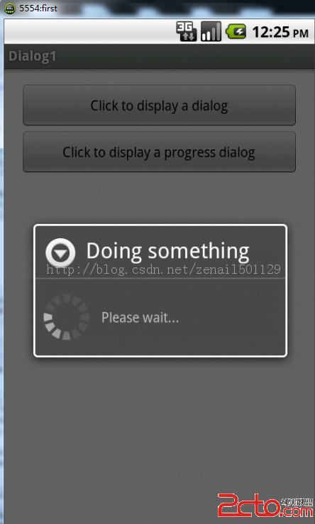 2、在MainActivity.java中添加一個onClick2()方法,添加的代碼塊如下:public void onClick2(View v) { // ---show the dialog--- final ProgressDialog dialog = ProgressDialog.show(this, "Doing something", "Please wait...", true);//創建一個進度對話框 new Thread(new Runnable() {//使用Runnable代碼塊創建了一個Thread線程 @Override public void run() {//run()方法中的代碼將在一個單獨的線程中執行 // TODO Auto-generated method stub try { // ---simulate doing something lengthy--- Thread.sleep(5000);//模擬一個耗時5秒的操作 // ---dismiss the dialog--- dialog.dismiss();//5秒鐘後,調用dismiss方法關閉進度對話框 } catch (InterruptedException e) { // TODO: handle exception e.printStackTrace(); } } }).start(); }